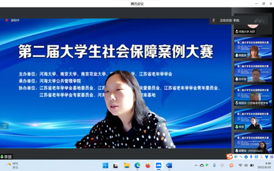 为积极应对人口老龄化国家战略,推动新时代社会保障高质量发展,加强校企合作,提升劳动与社会保障及相关专业大学生的理论基础、实践能力与综合素质,“第二届大学生社会保障案例大赛”于2022年8月20日以线上腾讯会议方式举行。本次大赛由江苏省老年学学会、河海大学、南京大学、南京农业大学、南京师范大学联合主办,江苏省老年学学会基地委员会、江苏省老年学学会精神关爱委员会、江苏省老年学学会青年委员会、江苏省老年学学会专家委员会、河海大学科协科技创新智库基地协办,河海大学公共管理学院承办。全国各地有40多所高校90支队伍约300人参加了本次大赛。河海大学教务处副处长吴志勇教授、江苏省老年学学会会长施国庆教授、南京大学劳动人事与社会保障系主任严新明教授、南京农业大学社会保障学科负责人李放教授、南京师范大学社会保障学科负责人郭爱妹教授、河海大学公共管理学院副院长孙中艮教授、河海大学社会保障学科负责人及系主任韩振燕教授、河海大学社会保障系副主任陈际华副教授以及来自南京大学、四川大学、西安交通大学、厦门大学、南京农业大学、西华大学、中南财经政法大学、云南大学、中国海洋大学、西北工业大学、上海师范大学、苏州大学、南京医科大学、西南医科大学、江苏师范大学、河北经贸大学、南京师范大学和河海大学等高校的10支队伍和部分参赛学生约80人参加了线上决赛和颁奖仪式。